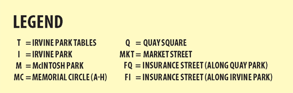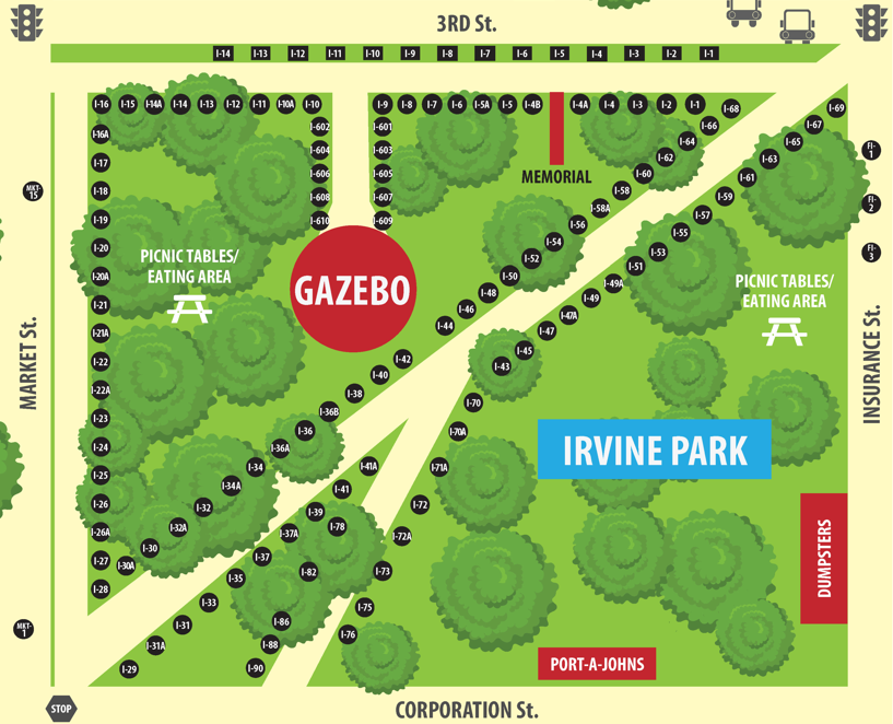 TRASH PICK UP & REMOVAL: Each vendor will be supplied a TRASH BAG at VENDOR CHECK-IN. Each vendor is responsible for trash pick up and removal in their designated space. Please take filled trash bags to provided dumpster located at the corner of INSURANCE ST. and CORPORATION ST. in IRVINE PARK. Please do not put VENDOR trash in park trashcans which are located throughout Quay, Irvine and McIntosh Parks as these are used to collect trash from attendees.  Please DO NOT leave trash around our parks!